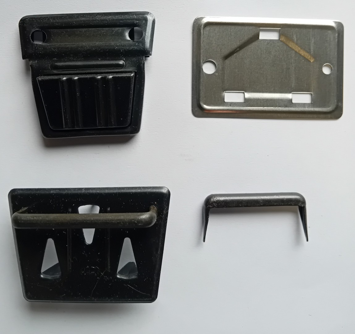 Fermoir complet en 4 éléments : partie mobile, bouton poussoir, partie fixe et plaque arrière